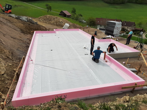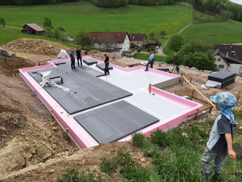 Die Unterlagen für die Fußbodenheizung, in der Bodenplatte integriert, werden gelegt. |