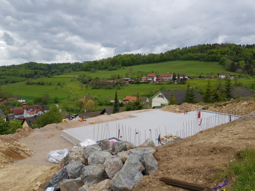 Die Halbkellerwände und der Fahradkeller unter der Garage wurden erstellt.-- kleines privates Video -- Unsere Hausbaufirma hat einen kleinen Reklame-Film über unser Haus und den gerade zu erstellenden Teilkeller gedreht:-- Hanggrundstück für Bau? [Live von der Baustelle] --. Dieser Film ist über Youtube veröffentlicht. |