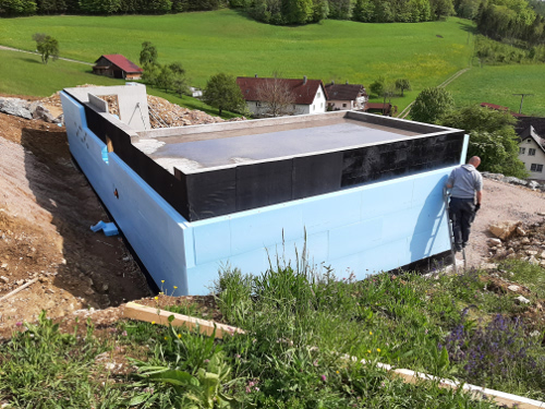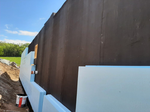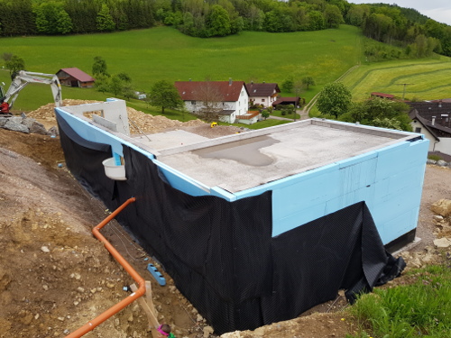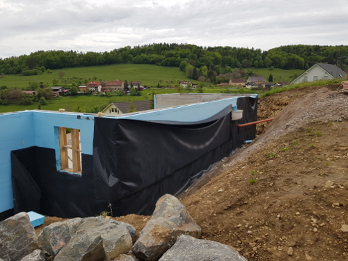 Die Wanddämmung wurde fertiggestellt und im Bereich vom Erdreich wasserfest gestrichen. Es wurde schützende Folie angebracht. Der Wind hat in den letzten Tagen etwas daran gerissen. |