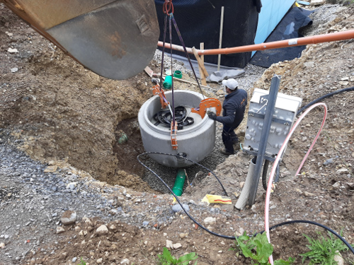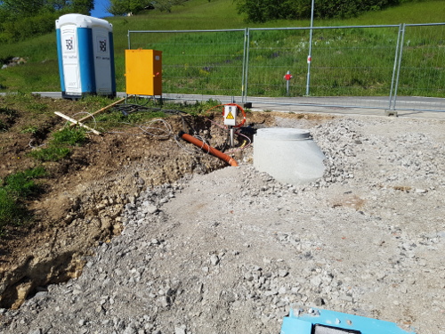 Der Übergabeschacht ist fertig und zugeschüttet. Für die spätere Zufahrt zur Garage ist der Schacht etwas zu hoch. |