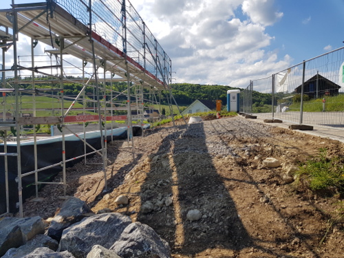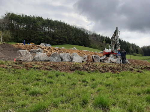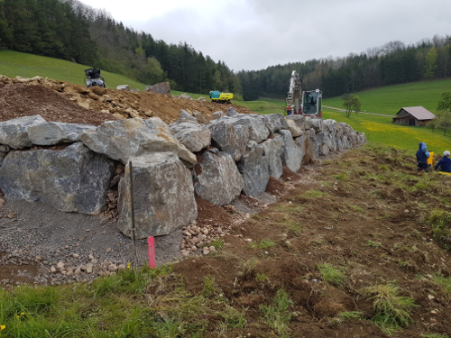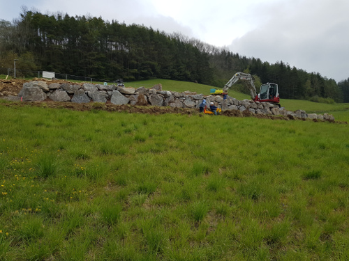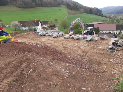 Die Fundamentebene ist begradigt und die Natursteine, für die Mauer an der unteren Grundstückskante, werden den Hang runter gebracht. |