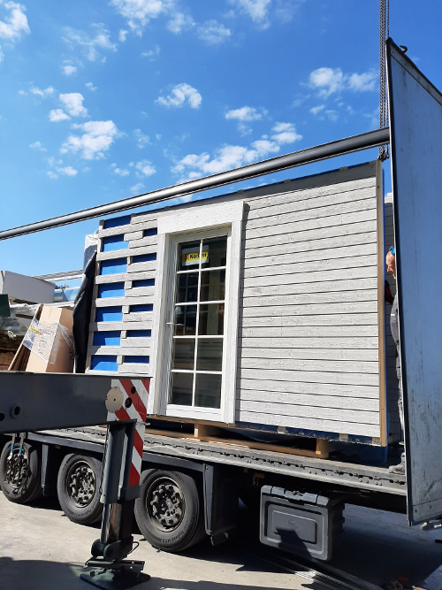 Die Garage wird nun aufgebaut und muss angepasst werden. Der Keller darunter wurde nicht nach Plan gefertigt. |