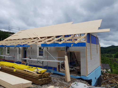Das Dach zur Hangseite ist nun auch gedeckt und die Regenrinnenhalterung angebracht.Unsere Hausbaufirma hat einen weiteren Film über unser Hausaufbau gedreht:-- Schwedenhaus bauen trotz strenger Bauvorschriften! [Anleitung & Aufbau] --. Dieser Film ist über Youtube veröffentlicht. |