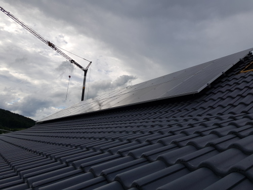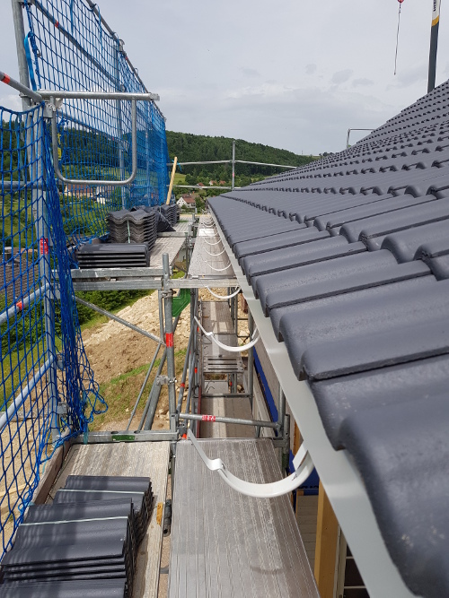 Dachsteine wurden mit einem Kran aufs Dach gehoben und verteilt. |