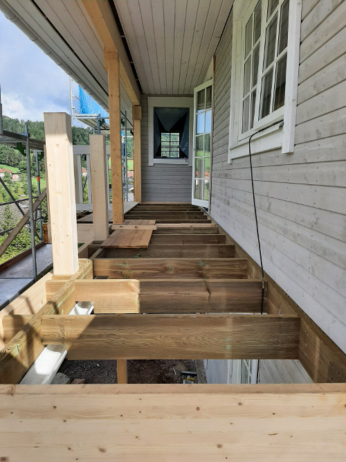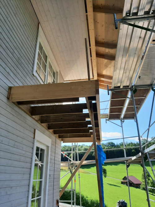 Mit dem Vordächern der Veranda und des Balkons, auf der anderen Seite, wurde begonnen. |