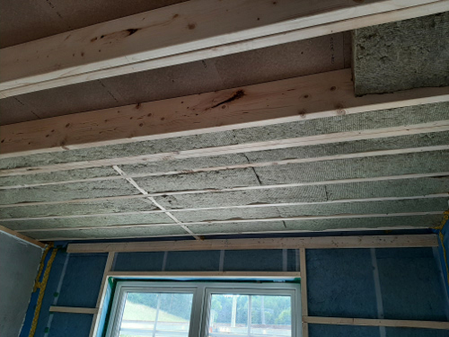 Die Deckendämmung wird auf dem Dachboden gelagert. |