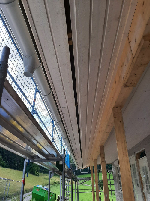 Das Vordach auf der Straßenseite ist verkleidet und hat eine Regenrinne. |