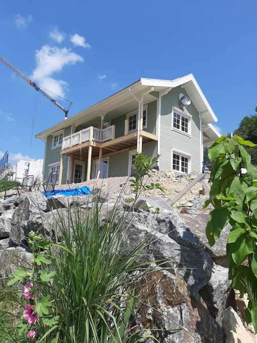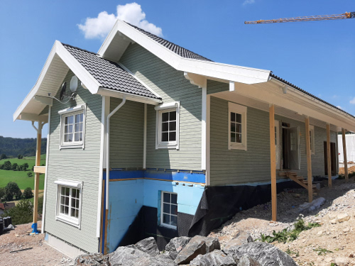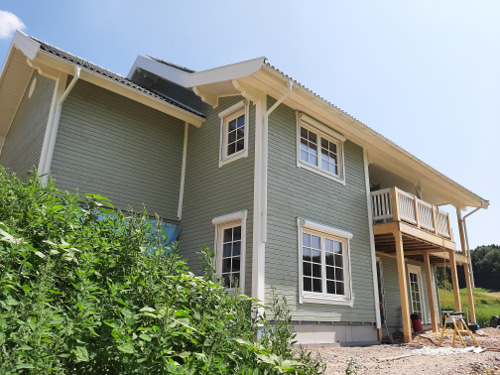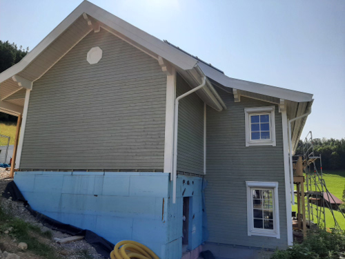 Mit dem Hausanstrich wurde zwar begonnen, aber die Hausaußenverkleiden ist noch nicht ganz fertig. |